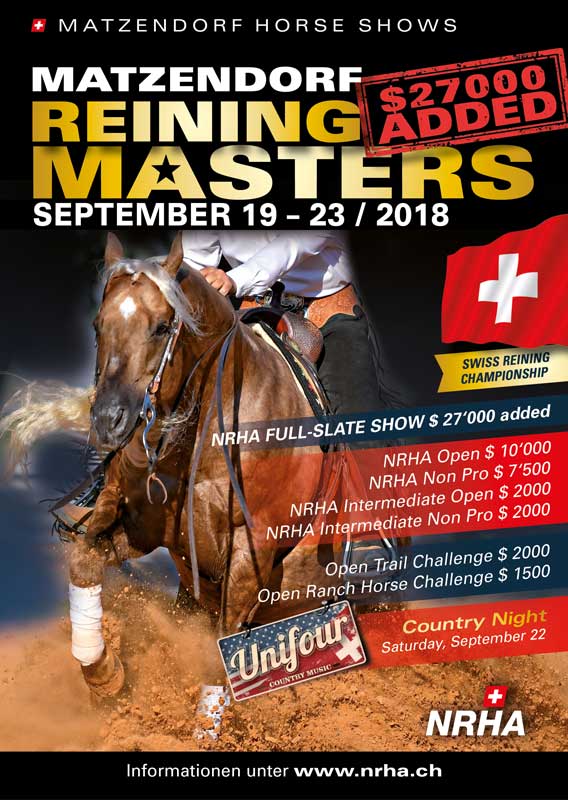 Vom 19. bis zum 23. September 2018 findet ein Reining Event der Spitzenklasse in der Schweiz statt, der erneut Reiter der Spitzenklasse aus Europa anziehen wird. Nach der erfolgreichen erstmaligen Austragung 2017 wird das Matzendorf Reining Masters 2018 erneut durchgeführt. Das Added Money wird 2018 mit $27 000 noch attraktiver ausfallen. Alleine die Non Pro Trophy wird ein garantiertes Preisgeld von $7 500 aufweisen und die Open Trophy wird mit $10 000 die höchstdotierte Prüfung des Events sein. Als weitere Attraktion wird die Schweizermeisterschaft in Reining anlässlich der Matzendorf Reining Masters stattfinden. Die Vorläufe werden am Freitag und die Finalläufe am Samstag «class in class» mit den Trophies ausgetragen. Für Abwechslung sorgen die Vaquero Shop Trail Challenge, neu mit einem Preisgeld von CHF 2 000 dotiert und die mit einem Preisgeld von CHF 1 500 ausgeschriebene Ranch Riding Challenge. Am Samstagabend wird wieder die traditionelle Country Night stattfinden. Die Schweizer Band UniFour rockt das Zelt und sorgt dafür, dass die heisse Stimmung nach den Finals noch lange nicht abkühlt. Matzendorf Reining Masters Schweizermeisterschaft in Reining Datum: 19. bis 23. September 2018 Ort: Sport and Horses, Matzendorf SO Country Night mit UniFour: Samstag, 22. September 2018 Programmheft zum Download >>Zum Livescoring >>