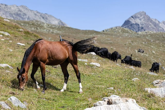 Die Stute ist im gemischtaltrigen Herdenverband aufgewachsen und hat einen sehr guten Charakter, sie ist sehr menschenbezogen, Verladen, Hufschmied sowie Kühe, Hunde und landw. Maschine, kennt sie gut. Die Sommermonate verbringt sie auf Hochalpen im Engadin, dadurch ist sie sehr trittsicher und geländegängig und bewegt sich sicher.